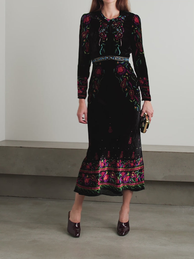 Make a statement in the luxurious Claudia midi dress. Crafted from plush velvet in a baroque floral print, it shimmers with elegance from every angle. The twisted neckline and hand-beaded waist perfectly enhance your silhouette, while deep purple and red tones add a hint of drama. A timeless piece for evening allure — sophisticated, bold, and unforgettable.